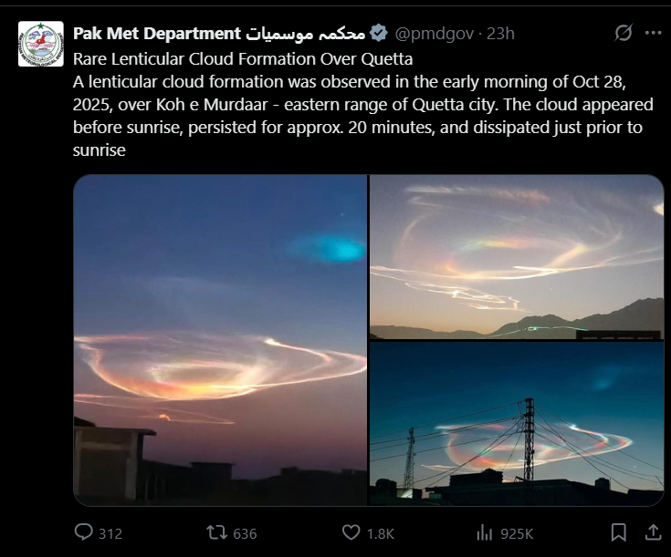 In a post on X, the department stated that “a lenticular cloud formation was observed in the early morning of Oct 28, 2025, over Koh-e-Murdaar — eastern range of Quetta city.”