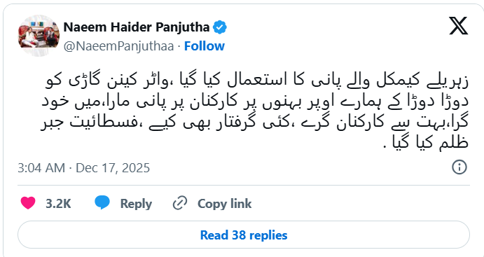 PTI lawyer Naeem Panjutha said several workers fell during the operation and others were forcibly arrested, calling the police action “deliberate brutality.”