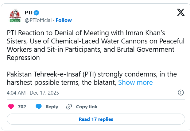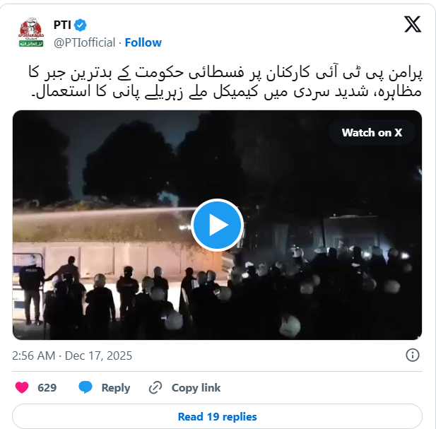 In a statement issued on social media, PTI’s central information department denounced what it called the “blatant disregard of the IHC order” and described the police action as “extreme state brutality.”